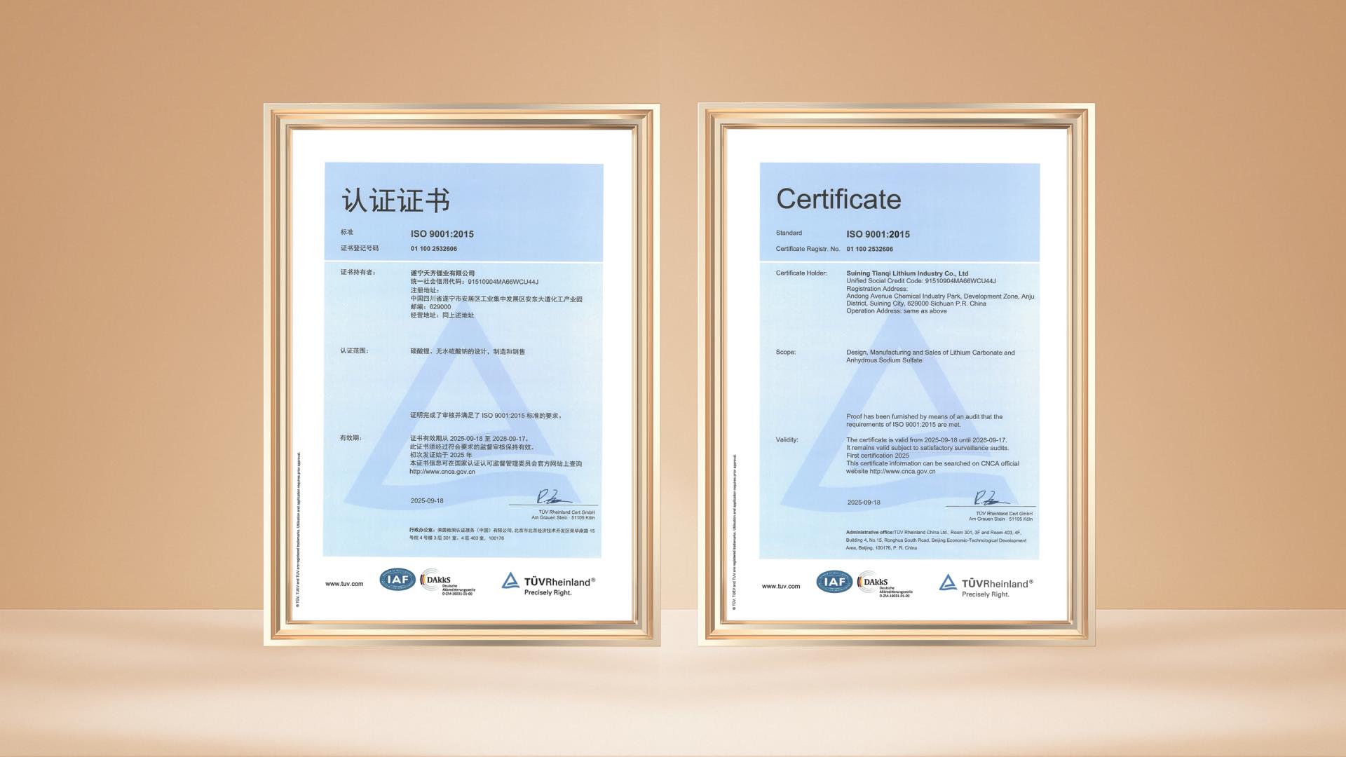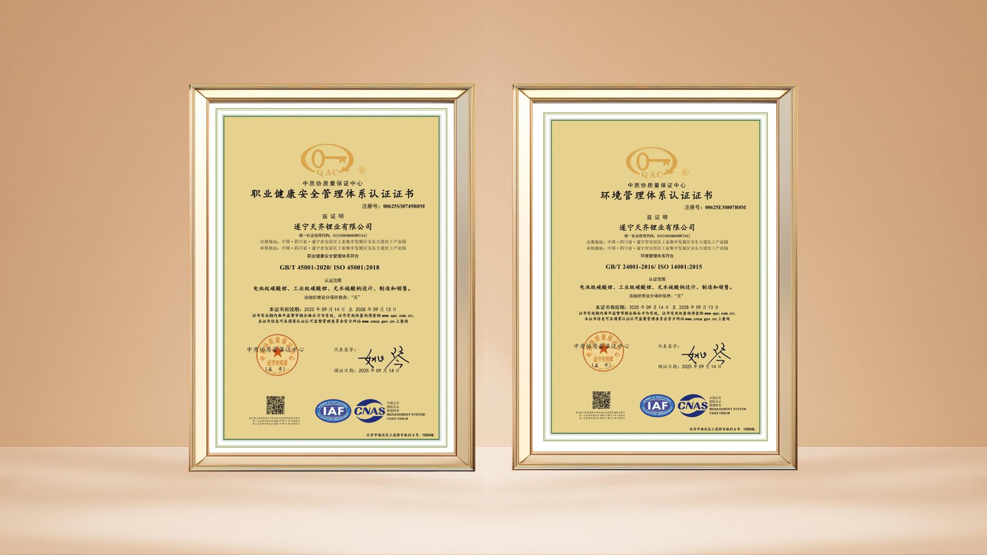 Recientemente, Suining Tianqi Lithium Co., Ltd. (en adelante, "Base de Anju") superó con éxito las rigurosas auditorías realizadas por el Centro de Certificación de Calidad de China y el Grupo TÜV Rheinland, obteniendo tres certificaciones de sistemas de gestión. Estas abarcan la certificación del sistema de gestión de calidad ISO 9001:2015, la certificación del sistema de gestión de calidad automotriz IATF 16949:2016 y la certificación integrada del sistema de gestión medioambiental ISO 14001:2015 y del sistema de gestión de salud y seguridad en el trabajo ISO 45001:2018.