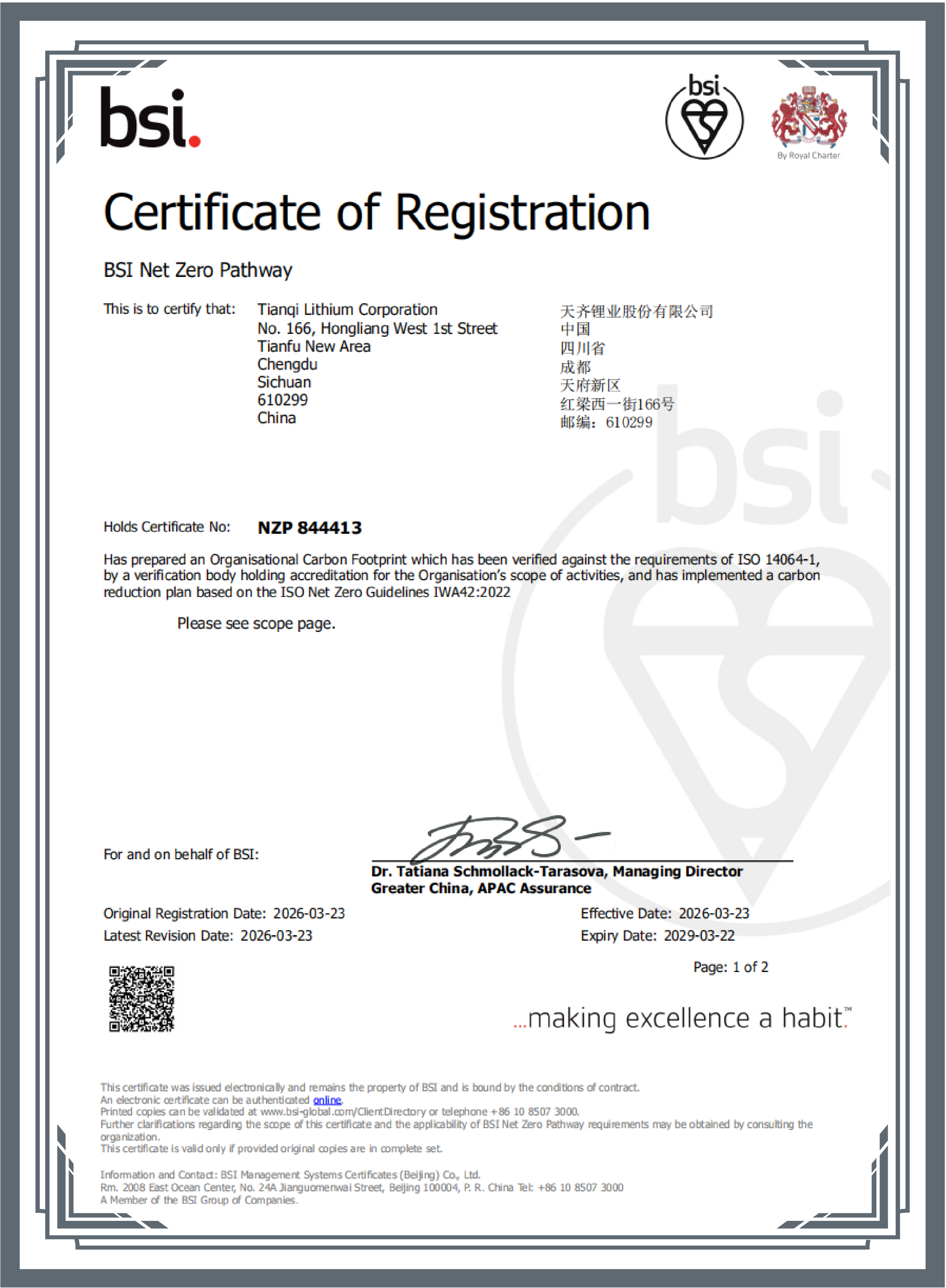 Recientemente, Tianqi Lithium obtuvo oficialmente la certificación ISO IWA 42 sobre directrices para las emisiones netas cero, otorgada por la Asociación Británica de Normalización (BSI), convirtiéndose así en la primera empresa china en aprobarse por la certificación referida y, al mismo tiempo, en la primera del sector del litio a nivel mundial en obtenerla. Esto supone que Tianqi Lithium ha establecido un sistema completo, conforme a los requisitos de las normas internacionales, para la planificación y gestión sistemáticas de su trayectoria hacia las emisiones netas cero.
