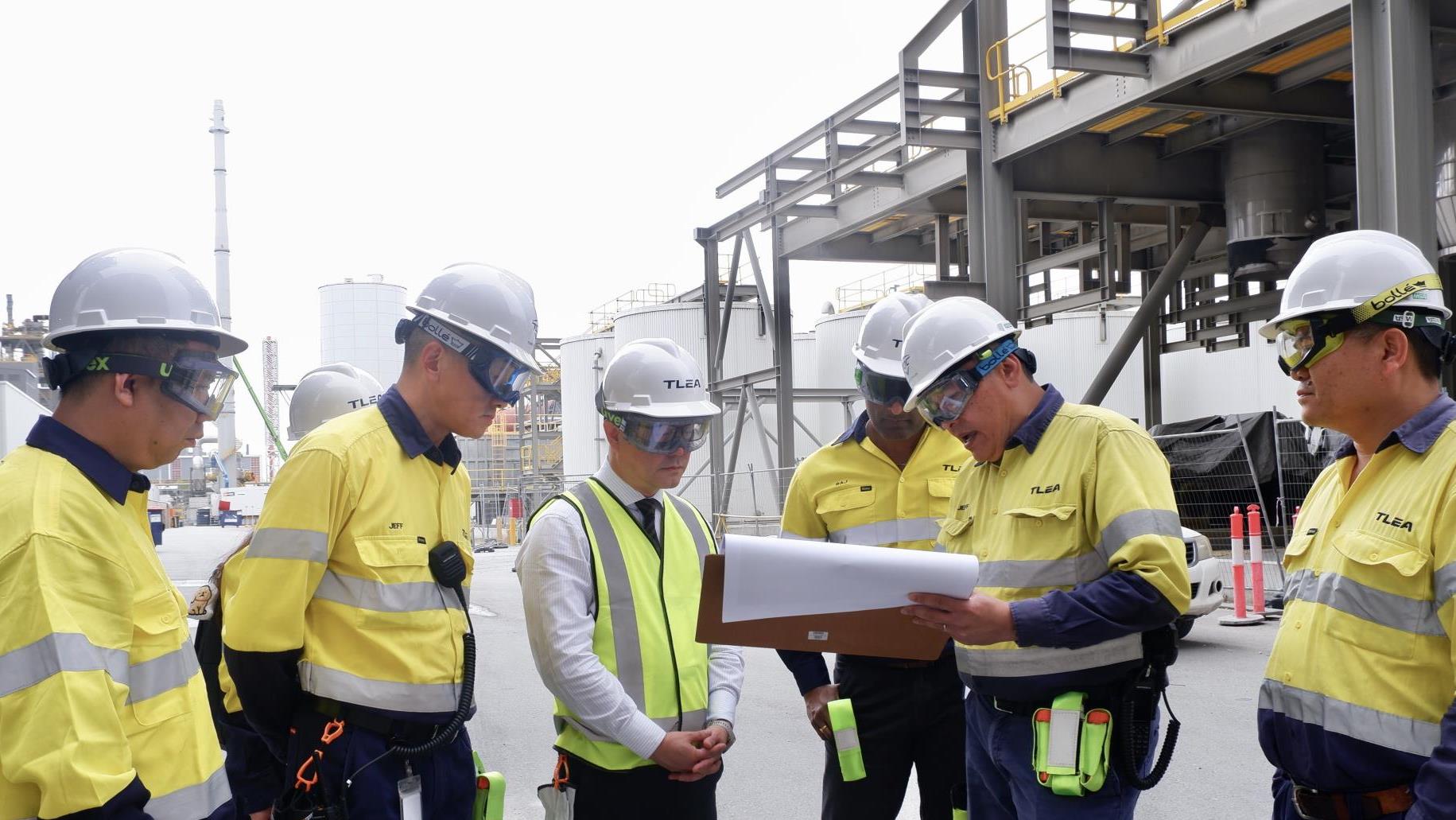 Ejecutivos de Tianqi Lithium inspeccionan la base de producción en Kwinana, Australia