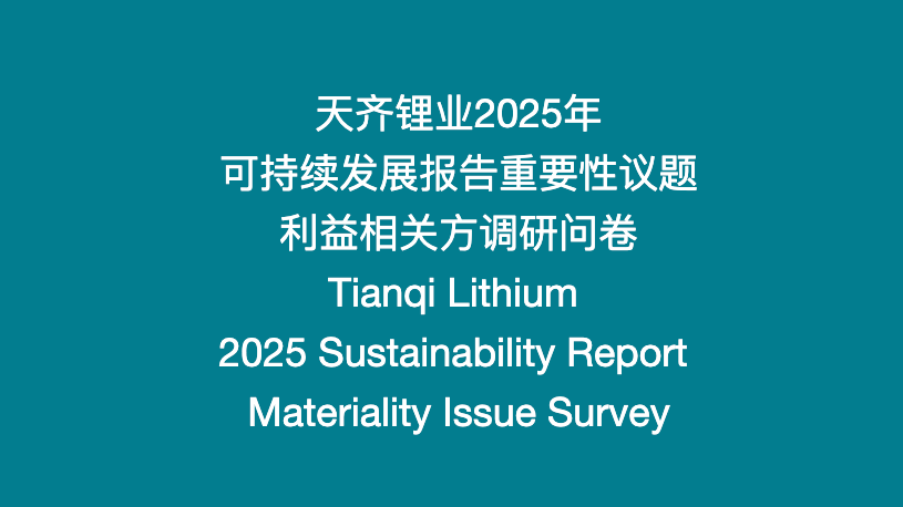 Con el fin de mejorar continuamente nuestra capacidad de creación del valor y seguir avanzando en el camino hacia el desarrollo sostenible de la empresa, Tianqi Lithium le invita cordialmente a participar en nuestra encuesta a las partes interesadas sobre temas materiales para el Informe del Desarrollo Sostenible 2025. Este cuestionario es anónimo. Nos comprometemos a mantener la más estr