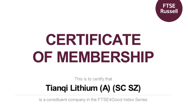 Tianqi Lithium fue seleccionada para la Serie de Índices FTSE4Good por tercer año consecutivo